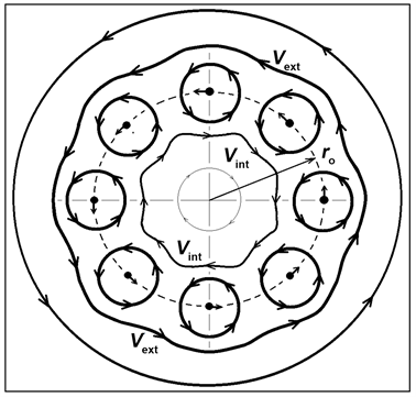 The previous Section 3 makes a quantitative analysis of the gravitational dynamics of a binary star system from the viewpoint of the HQS-dynamics gravitational mechanism. Now, consider an increasing number of stars, moving in the same sense along the same circular orbit round the CM and their velocity fields of the HQS rotating all in the same sense as their orbital motions, round axes that are all parallel to each other. Figure 4 displays a sketch of the collective velocity field, created by a system of eight equal stars. The figure shows that, with an increasing number of stars, the velocity in the collective velocity field increases and becomes smoother.