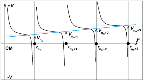 Note that this addition is not ruled by Equation (7) because the velocities are of the same mass. Going along the X axis toward the left hand side in Figure 3, on from the CM, there is an analogous velocity step at the position of M1, however increasing the (opposite) downward velocity (please see Figure 3). Note also that the magnitude of the velocity step depends on the square-root of the mass M as well as of , the distance from this mass. For instance, the velocity of the HQS in the solar Keplerian velocity field achieves 436 km/sec at the solar surface. However, at distances of the first neighbor star (Alfa Centaurus) the velocity is only about 60 meters/sec. The sun thus creates on its surface a velocity step of 872 km/sec from side to side and only of about 120 meters/sec at the distances of Alfa Centaurus.