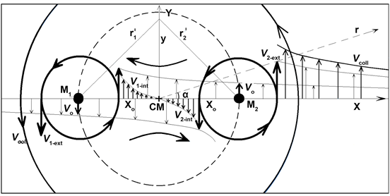 Consider two equal stars with equal masses , moving in the same circular orbit round their center of mass (CM) and the velocity fields, creating their individual gravitational fields, rotating in the same sense as the orbital motion round parallel axes attached to the center of these gravitational sources, as shown in Figure 3. These stars will be com-moving with the local HQS along circular orbits round the CM in the equatorial plane of the collective velocity field of the HQS, creating the gravitational field of the binary. Note that this configuration (axes forming less than 90 degrees) of the velocity fields is the only one leading to a stable bound system. It can be shown that stars with oppositely (anti-parallel) rotating velocity fields of the HQS cannot form a stable bound system, because, on approximating, their opposite velocity fields would add up and gradually cancel, thereby canceling their negative gravitational potentials. Such systems in fact must be anti-gravitating.