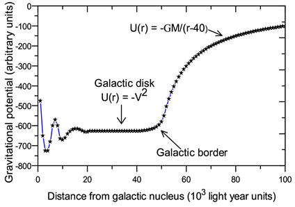 of our Milky-Way galaxy in Figure 1. The galactic gravitational potential curve, obtained in this way, is to be seen as approximately the observed potential. Especial attention is called to the region within the galactic disk. The result shows that, in this region, the gravitational potential is closely leveled, which, from the Newtonian gravitation viewpoint, means that the force field toward the galactic center is almost zero ( ). However, despite this absence, the stars are moving along circular orbits round the galactic center. From the usual mechanics point of view, this breaks fundamental principles of mechanics and seems absurd. Moreover, the spacetime curvature of GR too is well known to be unable to explain these observed orbital motions.