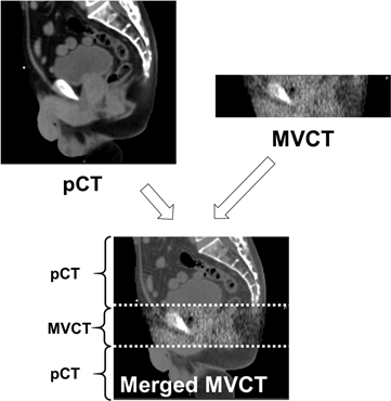 Figure 1. Concept of a merged MVCT. First, the rigid image registration was performed between the pCT and each fractional MVCT image. Then, the image region outside the MVCT was replaced with that of the pCT.