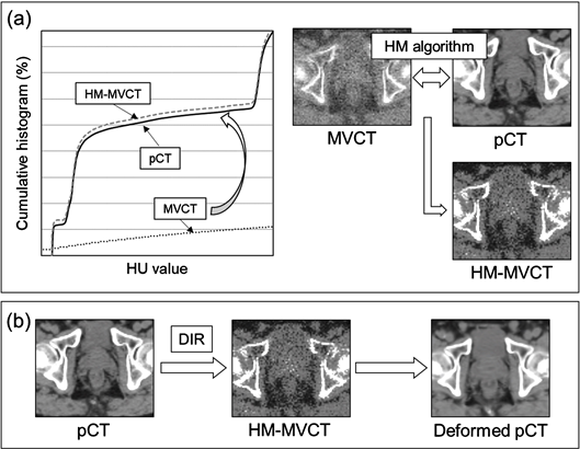 The algorithm between the pCT and the fractional MVCT was applied to improve the accuracy of pCT to MVCT deformation. Figure 2(a) shows the procedure of the HM method. To minimize the effect of different HU values between pCT and MVCT, this image-processing method adjusts HU values between pCT and MVCT images by using image cumulative histograms of HU values, generating an HM-MVCT. The HM method was performed by a script generated using MATLAB 2016a (Mathworks Inc., Natick, MA).