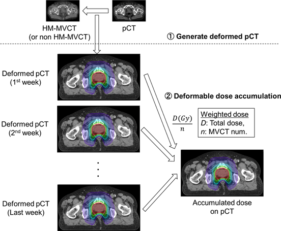 Figure 3. The workflow of the deformable dose accumulation in this study. First, each fractional deformed pCT was generated by using HM-MVCT (or non HM-MVCT). Then, the dose of the weekly deformed pCT was calculated. Finally, the deformable dose accumulation was performed toward the pCT image.