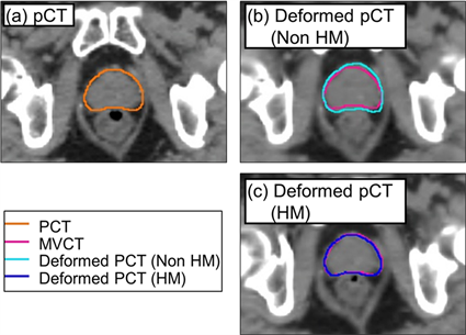 To evaluate the accuracy of the DIR, dice similarity coefficients (DSC) between deformed contours described in deformed pCT and manual contours described in original MVCT were calculated for CTV, rectum, and bladder, respectively. The DSC results of the HM method were compared with that of the non-HM method.