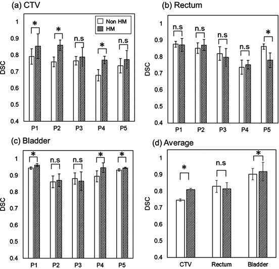 Figure 5. Patient individual dice similarity coefficient (DSC) between manual contours on the each fractional MVCT and deformed contours on the deformed pCT for (a) CTV, (b) rectum, and (c) bladder, and the average DSCs of all patients are shown in (d). Asterisk symbols (*) indicates a significant difference between two methods (p<0.05). The mean DSC of the non-HM method was 0.75 ± 0.05, 0.83 ± 0.06, and 0.90 ± 0.04 for the CTV, rectum, and bladder, respectively, while that of the HM method was 0.81 ± 0.06, 0.81 ± 0.04, and 0.92 ± 0.06, respectively.