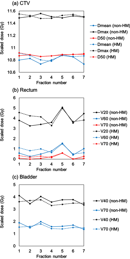 The dose calculation was performed for each fractional deformed pCT. Figure 6 shows the fractional scaled dose changes of patient 1, showing (a) CTV, (b) rectum, and (c) bladder for non-HM method (solid line) and HM methods (dash line). For all five patients, the maximum dose deviations of a same fraction between non-HM and HM methods were 0.16 Gy (CTV mean dose), −0.19 Gy (CTV maximum dose), −0.16 Gy (CTV D50), −2.20 Gy (rectum V20), −1.62 Gy (rectum V60), −1.23 Gy (rectum V70), 1.9 Gy (bladder V60), and 1.23 Gy