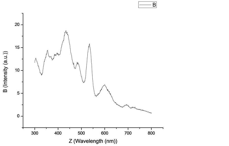 X-ray diffraction pattern was obtained on D8 advance X-ray diffractometer using Cu Kα radiation to identify the various different phases. The X-ray diffraction intensity was recorded as a function of Bragg’s 2θ in the angular range of 5˚ - 70˚. The Photo luminescence measurement was recorded in Instrument Model: F-7000 FL Spectrophotometer with Serial Number: 2249-002 over the wavelength range from 300 nm to 700 nm. Field Emission Scanning Electron Microscope (FESEM), model NOVA NANOSEM-430 of COMFEI and Energy-disper- sive X-ray spectroscopy (EDXA), Model X-MAX of Oxford was used for determination of morphology and microstructure. Sample was sonicated for a period of 15 minutes in acetone before mounting for FESEM and EDXA.