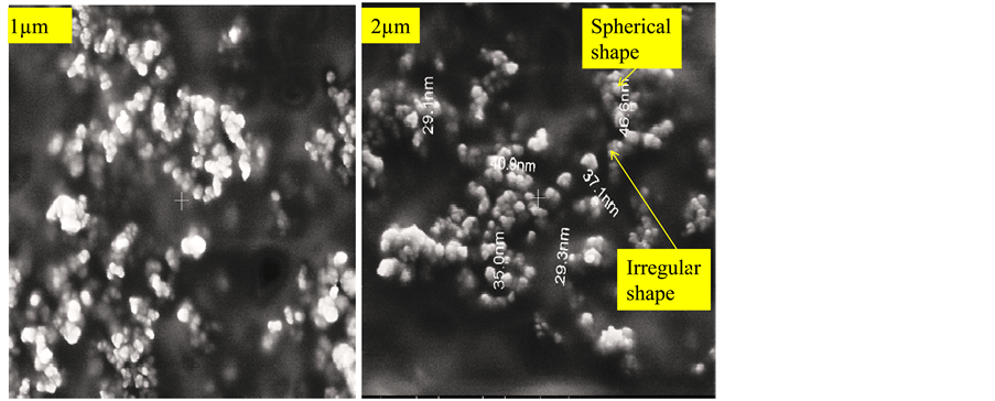 5) The FESEM studies revealed that the nanoparticles were almost spherical in shape with particles size in the range of 29 - 46 nm.