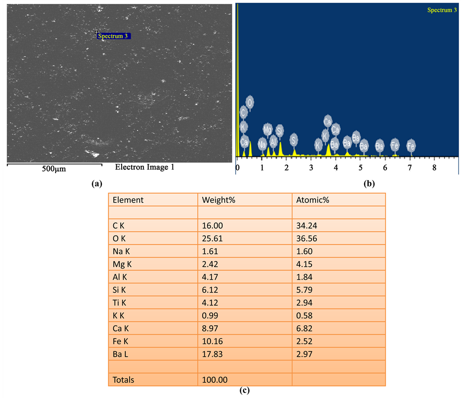 Figure 5. EDXA image of (a) synthesized of advanced ARMC shielding material. Selected area (b) EDXA outcomes (c) Elemental compositions (weight % and atomic %).