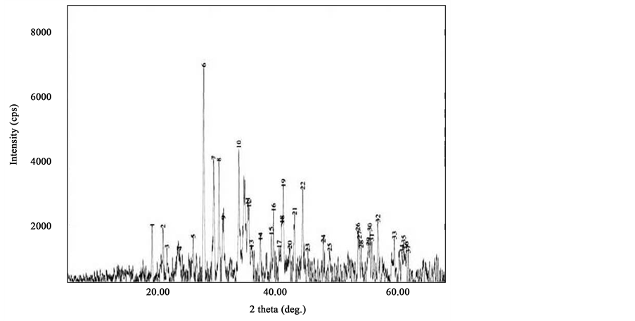Identification of the various phases present in the synthesized advanced EMI shielding material formed during the reaction process was carried out by comparing the experimental inter planar spacing (d values) with those of the respective likely substances listed in the JCPDS standard X-ray diffraction (XRD) data files [22] . The X-ray diffraction spectrum (XRD) of the synthesized EMI material is shown in Figure 2 and the respective phases identified are given in Table 2 respectively.