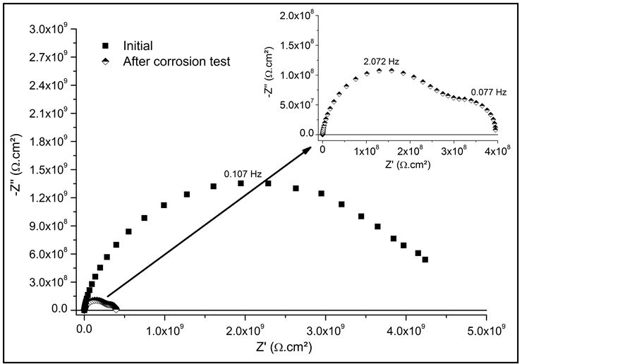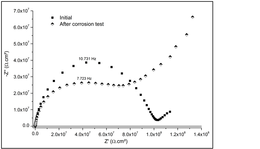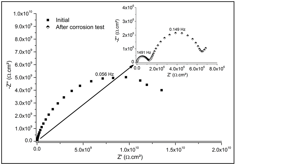 test, the frequencies at the maximum of the semicircle of the diagrams are in the same range. It is possible to extrapolate the semicircles to find Z’ and estimate the coating resistance. Before the corrosion test, the coating resistance was equal to 9×107 cm2 and after the test, to 8×107 cm2. So, after the test, the coating resistance showed a slight decrease and an additional resistive element tending to form a straight line superimposed at 45˚ to both axes, in the range of low frequencies. This behavior resembles Warburg impedance, due to partial diffusion control [1] . In the case studied, it can be associated with the diffusion of water through the coating. Considering the coating capacitance, it was equal to 0.2 nF/cm2 for both diagrams, a value in the same range found for sample D, suggesting that the barrier property is still good.