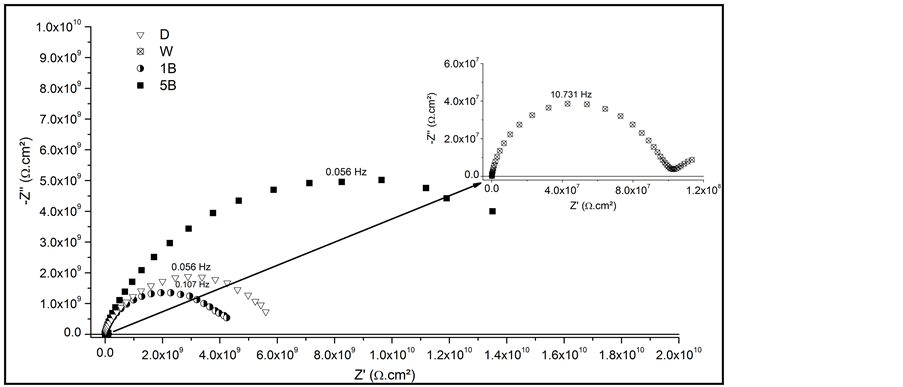 Figure 14. Nyquist plots for painted carbon steel samples, in 3.5% NaCl solution. In the subtitle, D refers to the dry blasted painted sample, the other designations to the washed samples, using deonized water (W), 1% borax solution (1B) and 5% borax solution (5B).