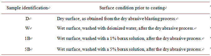 Table 1.Identification of metal samples, according to the surface condition after dry abrasive blasting
