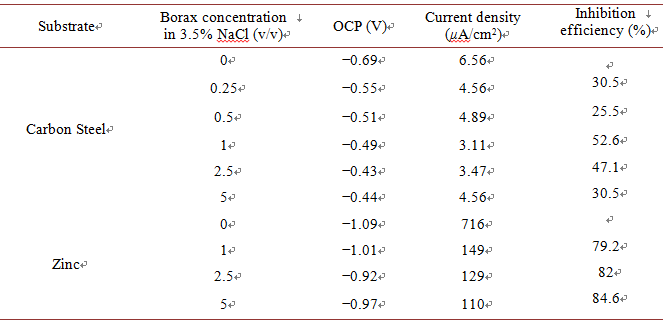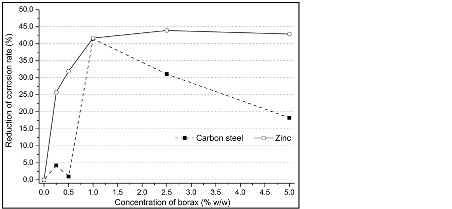 both cases, but with different mechanisms of action. It is remarkable that in both substrates, borax had optimum inhibitory concentration efficiency at about 1%. However, in the case of carbon steel, increasing the concentration more than 1% resulted in increasing the corrosion rate, what was not observed for zinc.