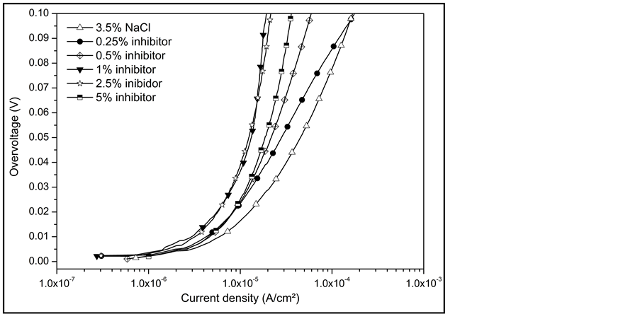 steel. However, there is a tendency at values of overvoltage lower than 0.04 V, in which polarization curves confirmed the anodic inhibition behavior of borax and showed an efficient performance in reducing current densities as function of its concentrations in solutions.