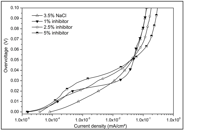 In Figure 4, it is possible to observe the anodic polarization curves for carbon steel in 3.5% NaCl solutions, containing different concentrations of borax. It is clear that the addition of the inhibitor shifted anodic curves towards lower current density ranges as compared with the curve in 3.5% NaCl solution without inhibitor. This kind of shift can be attributed to a decrease in the velocity of anodic reactions [1] . Still in Figure 4, higher current density reductions were observed with the concentrations of 1% and 2.5% borax, suggesting that the best inhibition effect is in this concentration range, a result that is also in agreement with mass loss tests. In fact, increasing borax concentration to 5%, there was a decrease in the inhibitory effect, with a shift of the curve towards higher current densities.