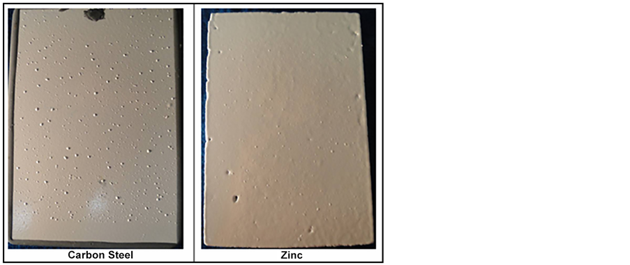 In Figure 6, it can be observed the appearance of the carbon steel and zinc samples prepared with 5% borax, after 24 hours of exposure in the humidity condensation test chamber, where both cases presented blistering. For carbon steel, blisters were classified as 4 (S3), while zinc presented blisters classified as 2 (S2), a smaller size and frequency when compared to carbon steel.