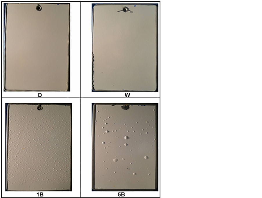 Figure 8. Painted zinc samples tested on the humidity condensation chamber after 336 h. In the subtitles, D refers to the dry blasted painted sample, the other designations to the washed samples, using deonized water (W), 1% borax solution (1B) and 5% borax solution (5B).