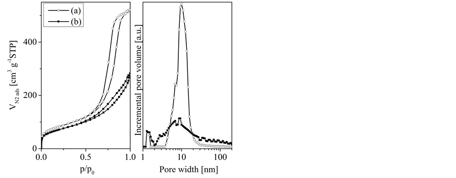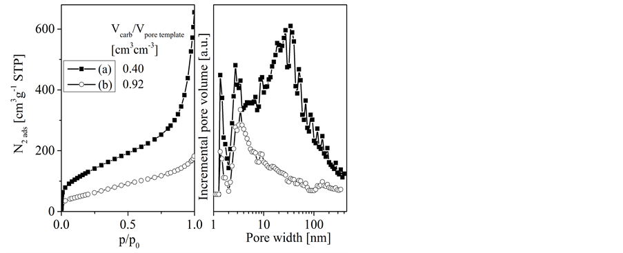 Nitrogen adsorption isotherms of selected carbon replicas are shown in Figure 9. The isotherms show a small increase in adsorption at low relative pressures indicating the existence of micropores. The corresponding values of the micropore volume are 0.06 and 0.18 cm3・g−1, respectively. These values are