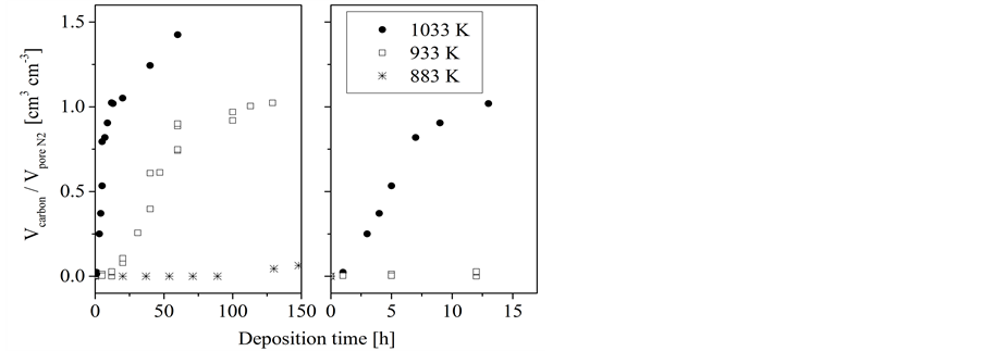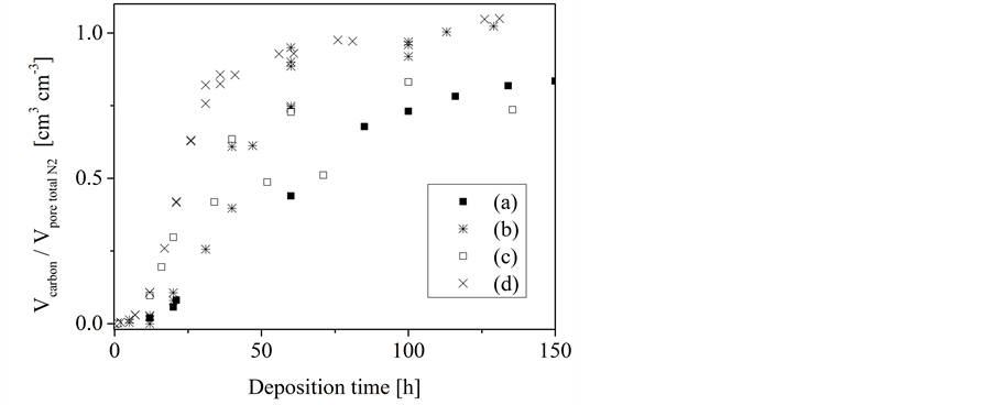 The time dependence of the carbon deposition has been observed on the basis of the ratio of infiltrated carbon volume to template pore volume. The volume of infiltrated carbon has been calculated by the mass gain assuming a skeleton carbon density of 2 g・cm−3. The single point volume obtained from the nitrogen adsorption isotherms has been used as the template pore volume because that volume comprises the micro- and mesopores. The carbon deposition mainly takes place in these pores as shown by x-ray tomography (Figure 2).