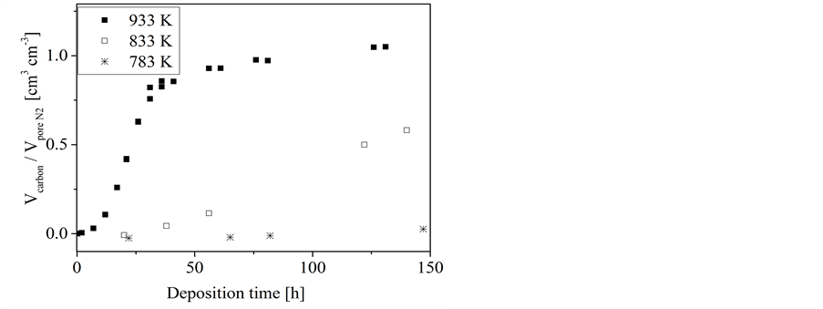 three-stage developing of the volume ratio has been observed. After an initial period whereas no remarkable carbon loading is observed an almost linear rise follows. In dependence on the deposition temperature, the slope of that linear rise decreases after a certain deposition time to a different extent. While in case of the highest investigated temperature (1033 K) the slope decreases only moderately it levels down to a nearly plateau like course at the lower temperature of 933 K. Only at the highest temperature (1033 K) the volume of deposited carbon can exceed the template pore volume as it is indicated by the ratio Vcarbon/Vpore N2 which is larger one at longer deposition time (Figure 3). The length of the initial period and the linear rise as well depends on the reaction temperature-the lower the temperature the longer these individual periods. The carbon loading at the end of the first linear stage corresponds nearly to a complete filling of the template pores. Complete pore filling could not be achieved by using sucrose solution as the carbon precursor even when applying repeated loading cycles.