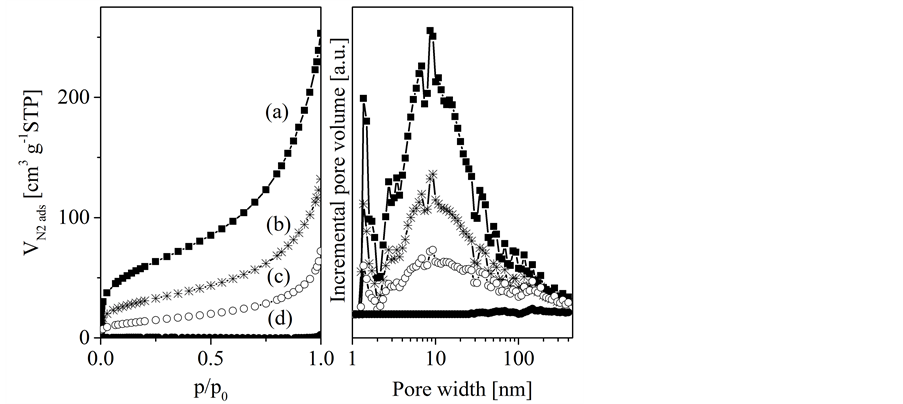 Figure 7. Nitrogen adsorption isotherms (left hand side) and according pore size distribution functions (right) of porous concrete (a) and carbon-porous concrete composite loaded at different periods: 3 hours (b), 5 hours (c), and 13 hours (d) with n-hexane at 1033 K.