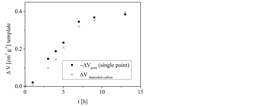 At the beginning of the procedure, the decline of the free template volume is somewhat larger than the volume of infiltrated carbon. This indicates a slight blocking of template pores (i.e. micro- and mesopores) by carbon. With increasing deposition time this difference decreases up to a crossing of the values. From that one can assume that either the blocking of pores disappears or the carbon loading in macropores becomes more significant. The latter mentioned effect would then overcompensate the effect of reduced carbon loading by blocked pores.