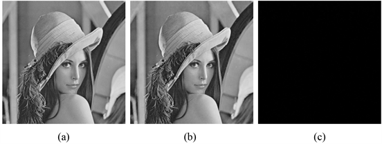 Figure 4. (a) Lenna cover image; (b) Lenna stego-image; (c) Difference image.