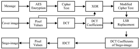 The proposed method combined AES, LSB replacement and DCT altogether to improve the data security. First the secret message is encrypted using AES Cryptography algorithm which generates a cipher text. The cipher text after