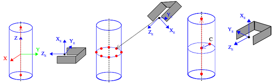 position of robotic hand is decided using this axis for grasping such as Figure 7. Search of the grasping point is simplified by using this axis. X, Y, and Z are direction vector of each coordinate axis of the axis for grasping. XE, YE, and ZE are direction vector of each coordinate axis of the robotic hand. First step: The direction of XE is made parallel to Z. Second step: A point on the closest circumference is searched. Third Step: ZE and C is made identical. C is direction vector to the axis for grasping from the closest point. The grasping point is decided by using 5 patterns of search direction such as Figure 8. First pattern is horizontal direction horizontal direction to the axis for grasping such as Figure 8(a). Second pattern is the pitch direction to the axis for grasping such as Figure 8(b). Third pattern is the roll direction to the axis for grasping such as Figure 8(c). Forth pattern is the yaw direction at the termination of the axis for grasping such as Figure 8(d). Fifth pattern is the pitch direction at the termination of the axis for grasping such as Figure 8(e). A closest point to the robot is chosen as the grasping point in the operating range of the robot finally.