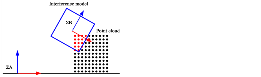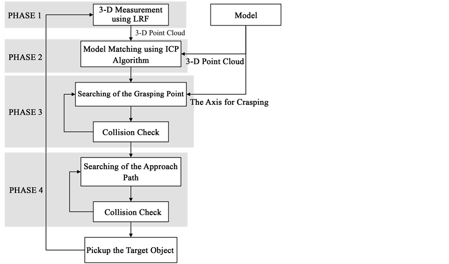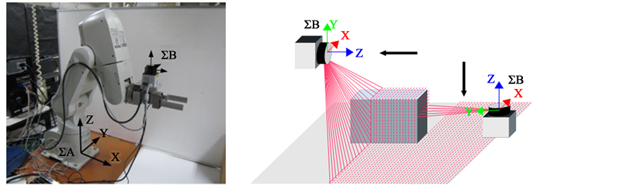 In this paper, we assumed bin picking operation using the two fingered robotic hand in the home, and target objects are placed on the flat face. 3-D information on those object is acquired using the LRF sensor. The LRF sensor is installed in the robotic manipulator such as Figure 1. ΣA is the coordinates of the robotic manipulator, and ΣB is the coordinates of the LRF sensor. The position and the posture of the objects are recognized as the 3-D information using a known model. The approach path to the recognized object is searched.