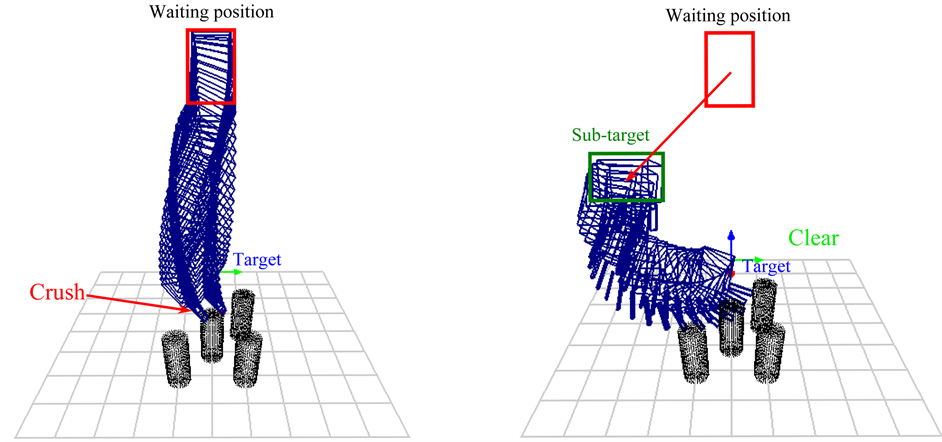 Search of the approach path has to consider collision problem like search of the grasping point. In this paper, the sub-targets are used to evade this problem. Several sub-targets are prepared beforehand by user. Collision problem is evaded by searching approach path via the sub-target such as Figure 11.