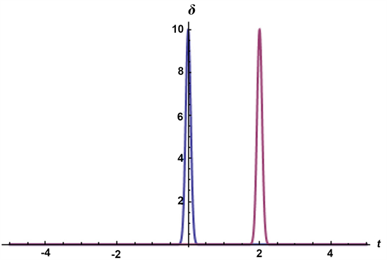 Figure 1. Narrow Gaussian approximation for the shifted Dirac delta-function: , corresponding to the values of (center) and (right).