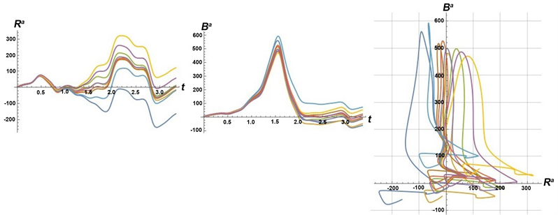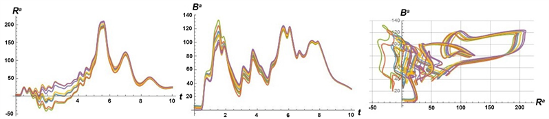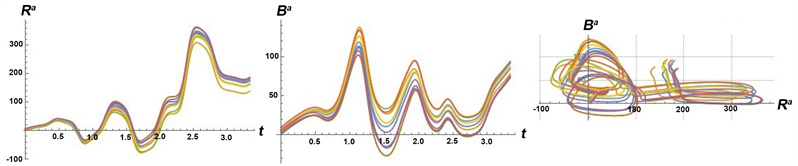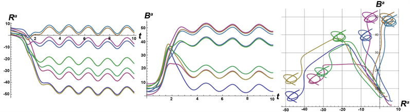 Figure 2. Sample simulation of the combat tensor Lie-Lanchester Equations (1)―for the comparison/calibration purpose: Red amplitude (left) is losing, Blue amplitude (center) is winning and Red-Blue phase plot (right) shows nine points of conflict; the amplitudes range from −50 to 50.