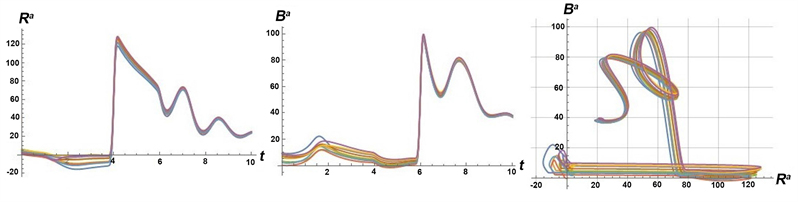 Multi-strike. Next, we have introduced a discrete-time multi-missile attacks by Red, , on a Blue target and Blue, , responding in the same way. We can see from Figure 4 that the amplitudes are now several times higher than in the single strike, for the Red the amplitude is all positive and for the Blue it starts negative and then grows positive. In contrast to the previous Figure, we can see now that the sequence of impulses leads to general irregularity, determined by the rate of the sequence of strikes, which cumulatively results in the increased complexity of the combat signature in the Red-Blue phase-plot.