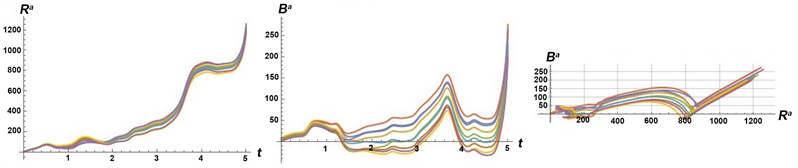 Figure 5. Sample Red-Blue combat simulation for 5 time units with both discrete and continuous strike-spectra given by Equations. (5) with the parameters given in the text. The amplitudes are similar as before, with the roles reversed: the Blue (center) the amplitude is all positive and for the Red (left) it starts negative and then grows positive. The Red-Blue phase-plot (right) is somewhat less complex, showing the filtering capacity of the integral in the continuous spectrum.