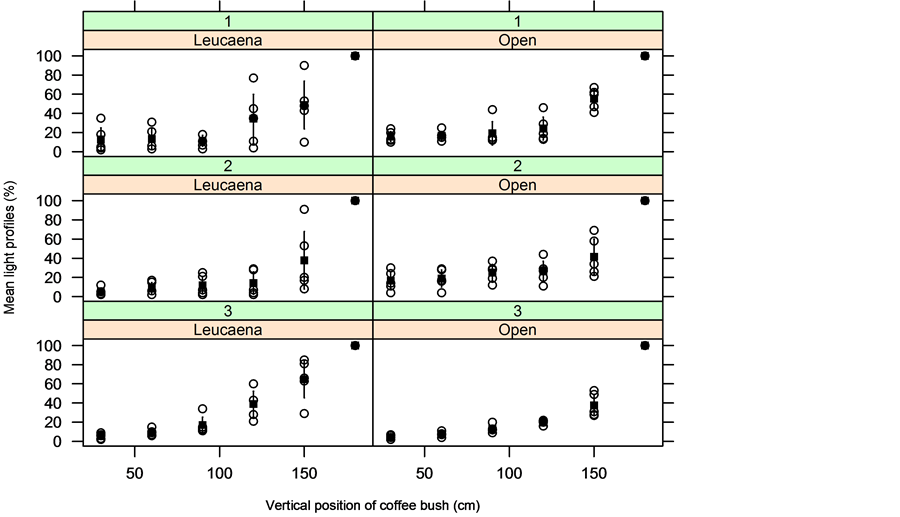 Figure 3. Light profiles for coffee bushes grown in the open or under Leucaena shade trees at coffee farms in Ia Grai, Gia Lai. Percentage of incident light transmitted through the canopy at 30, 60, 90, 120, 150, 180 cm above ground is shown. The white dots represent the raw data, the black dots show the means and the error bars show the 95% confidence intervals.