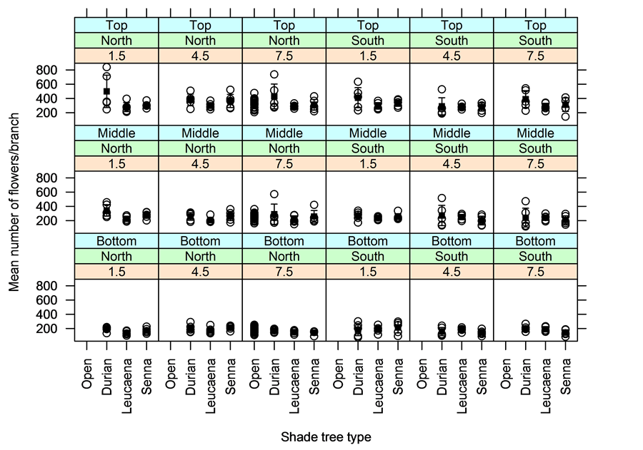 Figure 4. Flowers produced per branch at three differet heights within the coffee bush: 45 cm (Bottom), 90 cm (Middle) and 170 cm (Top). Coffee bushes were located at a site with no shade (Open, included as 7.5 m data) and sites with bushes located at 1.5, 4.5 or 7.5 m, in both N and S directions, from the stem of three types of shade trees (Durian, Leucaena, Senna) at coffee farms in IaGrai, GiaLai. The white dots represent the raw data, the black dots show the means and the error bars show the 95% confidence intervals.