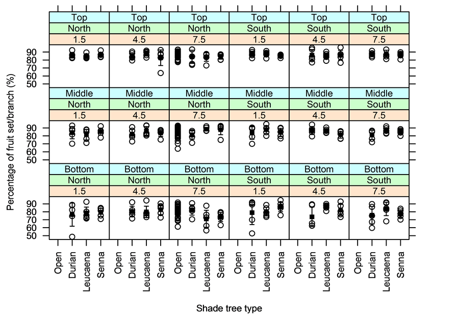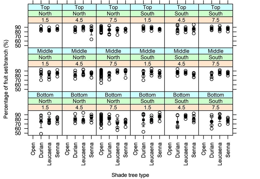 The average proportion of fruit set branch−1 bush−1 for all treatments was above 82% (84.1%, 83.3%, 82.9% and 82.6% for Leucaena, Senna, Open and Durian, respectively) (Figure 5), and there were no significant differences between any of the treatments (P = 0.4). There was also no effect of direction (P = 0.13) (N or S) nor position (P = 0.55) from the shade tree on the proportion of fruit set, however, vertical position was critical (P = 4e−11) with the top and middle of coffee bushes recording more fruit set than the bottom.