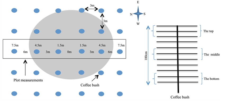 The position at the stem of the shade tree was marked as 0 m and the distance from this to the nearest coffee bush, in both directions, was 1.5 m. The distance between coffee bushes was 3 m and hence the distance from the stem of the shade tree to the farthest coffee bush was 7.5 m. The positions of the three coffee bushes, ranging from the nearest to farthest from the shade tree, were therefore labeled 1.5, 4.5 and 7.5 m respectively. At the Open site, five plots with six coffee bushes per plot were randomly allocated. For each coffee bush, measurements were also taken in the vertical plane on both the north and south side of each plant. These were taken from three levels, branches on the top, middle and bottom (Figure 1).