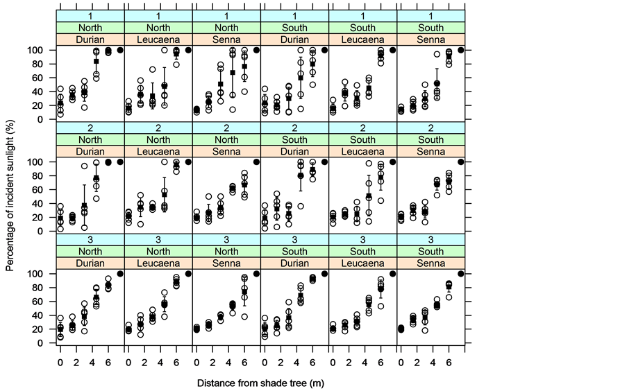 Figure 2. Percentage of incident sunlight measured under the canopy of coffee bushes grown under Durian, Leucaena or Senna shade trees; measurements were made to the north or the south of the coffee bush at distances between 0 and 7.5 m at 1.5 m increments from the shade tree stem at three time intervals during the growing season. The white dots represent the raw data, the black dots show the means and the error bars show the 95% confidence intervals.