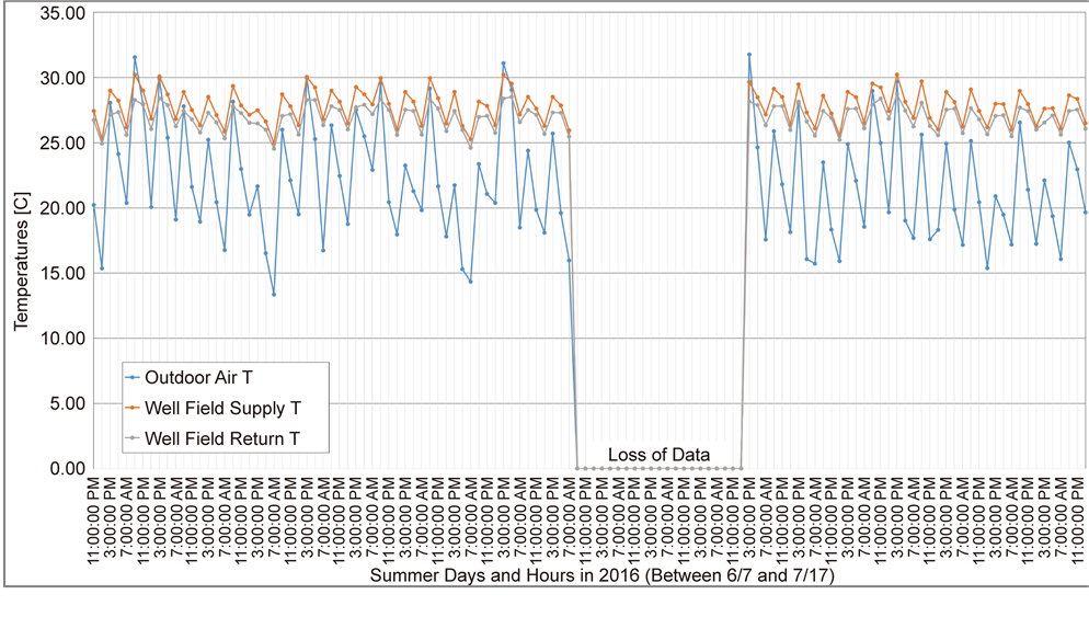 shows the supply and return water temperatures of the ground loop against the outdoor dry-bulb air temperatures during the summer of 2016 (6/7 - 7/17) with the full operation of the circulation pump. This indicates a very small loop temperature differential, and it follows a low efficiency and cooling capacity.