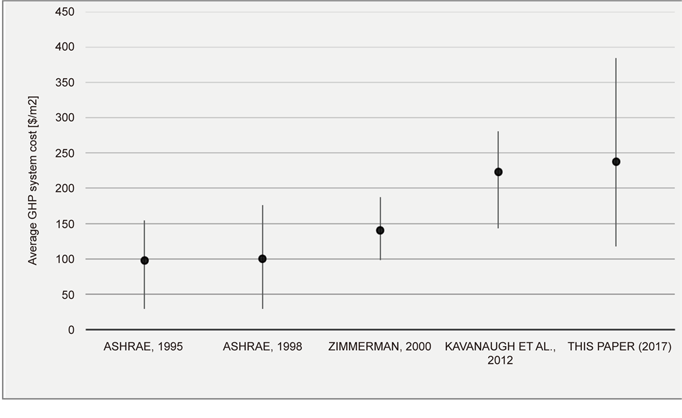 Table 11 shows the comparison of the average HVAC/GHP system cost (including the exterior and interior HVAC system costs) among different investigations and studies over time. Figure 5 indicates the trend of the average system cost in terms of $/m2. As shown in this figure, the average system cost rises gradually among the investigations from 1995 to 2017, and it has been increased by 143% (from 97.63 to 237.45 $/m2). This increase may indicate the loss of cost effectiveness to install and use a GHP system in a building, due to a longer payback period. This may eventually result in the loss of attraction of building owners/developers to GHP systems, who would rather use conventional HVAC systems that usually have low capital costs but consume more energy and fossil fuels, which will be against the original intention of the state or local governments about energy efficiency and environmental protection. Therefore, the financial support either from governments or utility companies, or both, would give a much needed shot in the arm to the popularity of GHP systems in North America by improving the cost effectiveness of using GHP systems, and thus encouraging the nationwide installation of GHP systems and making use of geothermal energy.