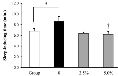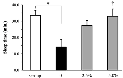 Figure 2. Effect of rice flour on the time to sleep introduction and the sleeping time induced by socially isolated stress in socially isolated mice (a) Time to sleep introduction, (b) Sleeping time (Mean ± S.E. n = 10, *: p < 0.05 vs. Group, †:p < 0.05 vs. 0).
