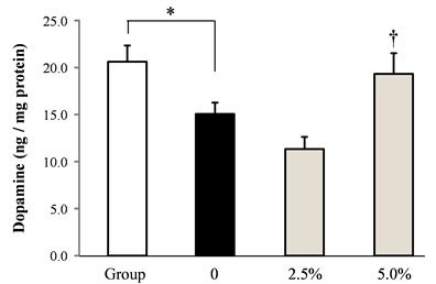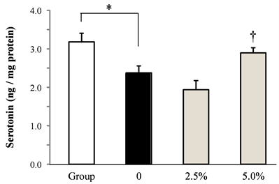 Figure 3. Effect of rice flour on serotonin and dopamine content in the frontal cortex of socially isolated mice (a) serotonin, (b) dopamine (Mean ± S.E. n = 10, *:p < 0.05 vs. Group, †:p < 0.05 vs. 0).
