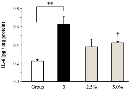 Figure 4. Effect of rice flour on the amount of IL-6 in the brainstem in socially isolated mice (Mean ± S.E. n = 10, *: p < 0.05 vs. Group, †:p < 0.05 vs. 0).