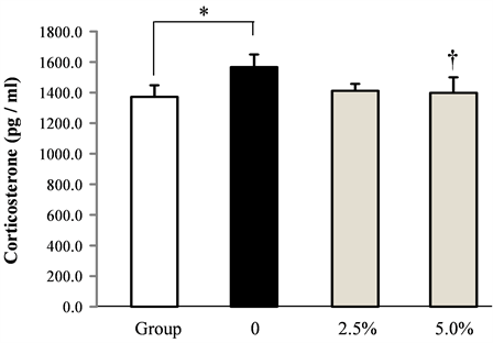 Figure 5. Effect of rice flour on blood serum corticosterone in socially isolated mice (Mean ± S.E. n = 10, *: p < 0.05 vs. Group, †:p < 0.05 vs. 0).