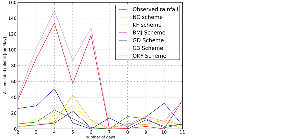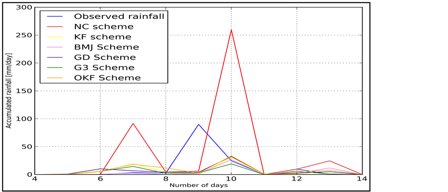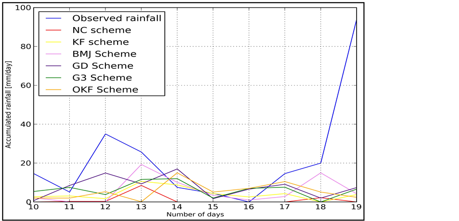 2) For rainfall forecasting over Tanzania, the model should not be configured with NC scheme and this is in agreement with the fact that in tropics rainfall is from convective activities.