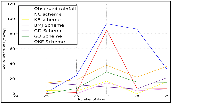 The impact on the quality of rainfall forecast of six CP’s namely: Non Convective (NC), modified Kain-Fritch (KF), Betts-Miller-Janjic (BMJ), Ensemble Grell-Devenyi (GD), Ensemble Grell 3 (G3) and Old Kain-Fritch (OKF) were investigated.