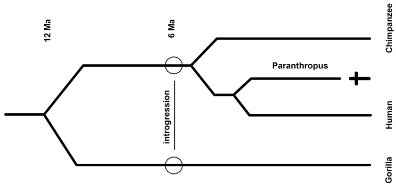 Figure 1. Phylogenetic tree showing how introgression caused the speciation of humans. This introgression speciation model predicts an early split for Paranthropus and Australopithecus, increasingly shown in the fossil record [15 - 18] and also shows that the evolution of genes that ended up in Australopithecus, and therefore in extant humans, as well as in Paranthropus, can and should be traced along the gorilla lineage as well.